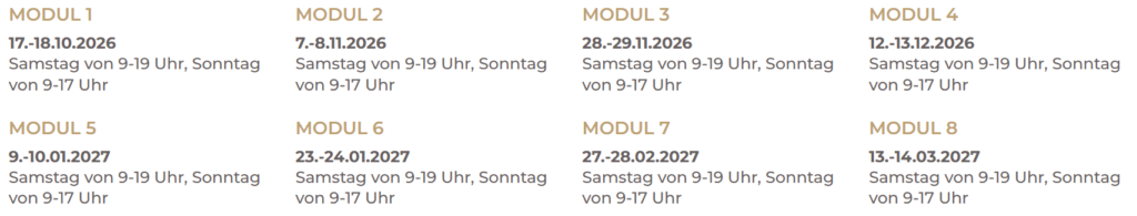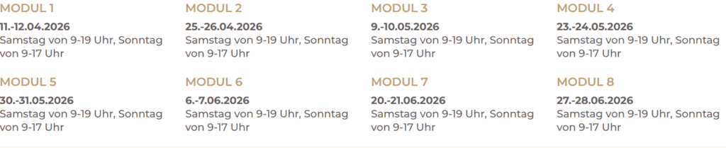 - Modularer Aufbau – jederzeit einsteigen: Das besondere an unseren Ausbildungen ist der modulare Aufbau. Die Module sind nicht aufbauend. Du kannst jederzeit einsteigen und die versäumten Einheiten in den parallelen und nächsten Ausbildungen kostenlos nachholen. Dieses einzigartige System ermöglicht dir eine flexible und zeitlich unabhängige Zusammenstellung deiner Ausbildung. Alle Informationen zu den Modulen findest du weiter unten.